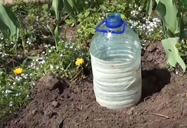 Додатково, щоб укрити молодий саджанець, ви можете взяти 5 літрову пляшку, з вирізаним дном і обмотану малярським скотчем, і поставити на кабачок. Це захистить його від вітру і можливих зворотних заморозків (в таке випадку кришку на баклажки слід закрити).
