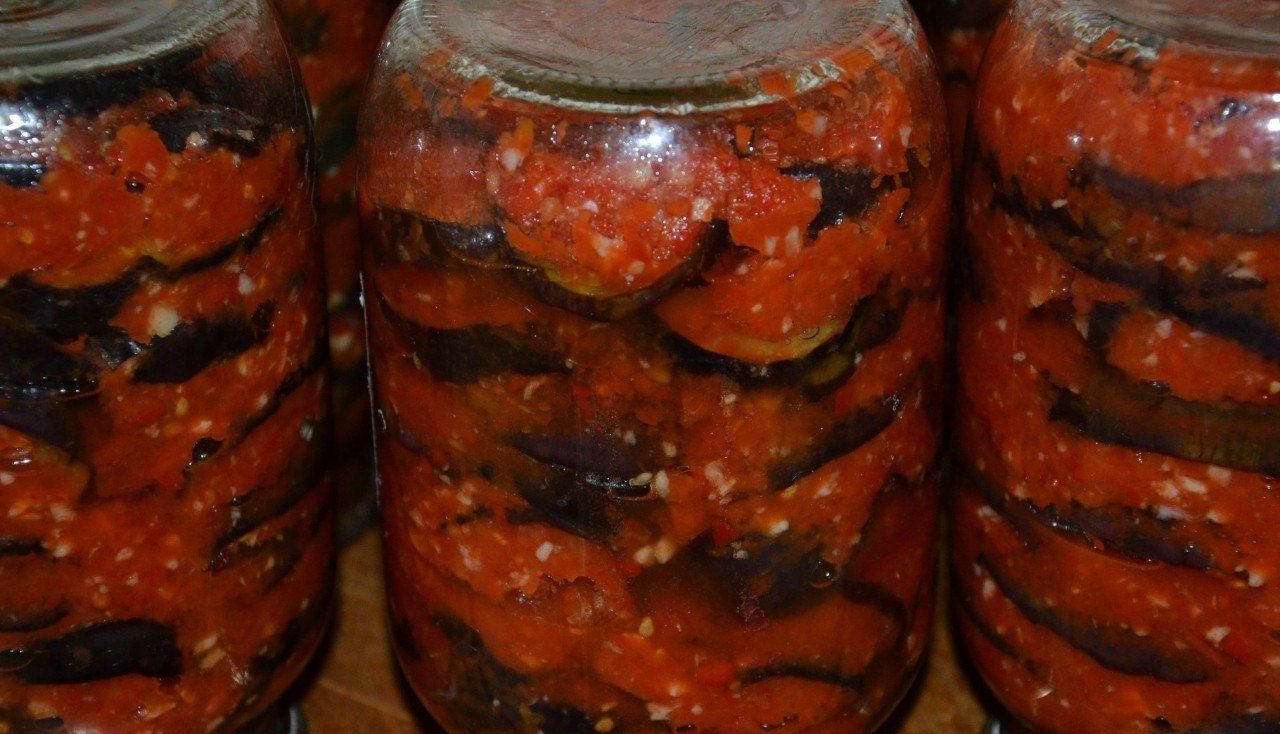 - Кожен баклажанний мову вмочається в отриманий соус, скручується рулетом, а потім закладається в скляну ємність.