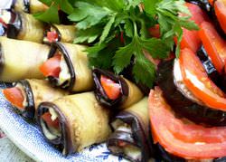 - Потім кожен баклажановий скибочку скручується в рулет.
