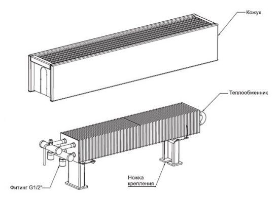 Конструкція являє собою мідну трубу, яка оснащена алюмінієвими пластинами, а сам корпус виготовляється зі сталі. Внизу і вгорі є отвори: через нижні входить холодне повітря, через верхні – виходить нагріте. Безперервно циркулюючи, повітряні потоки обігрівають приміщення.