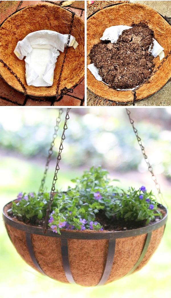 4. Кокосові кашпо дуже красиво виглядають, їх використовують для оформлення веранди і дачного ганку. Однак у них є істотний недолік – швидко висихає грунт, таке кашпо потребує щоденного поливу. Щоб волога зберігалася довше, при посадці покладіть вниз дитячий підгузник. Ось вже дійсно дачні потрібність.