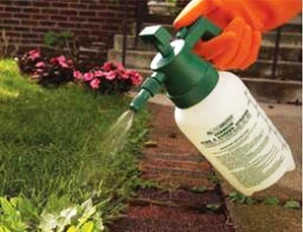 2. Знищуйте бур'яни домашнім нетоксичним засобом. Для цього розведіть 4 л оцту, 250 г харчової солі і 1 ст. л. засоби для миття посуду. Все це перемішайте, залийте цим розчином садовий обприскувач, і обприскують їм бур'яни в спеку.