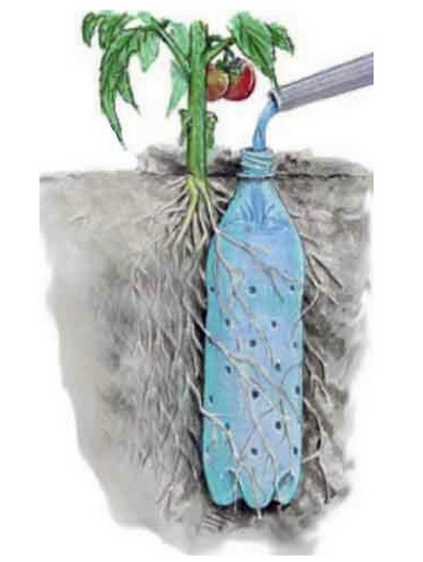 15. Більшість рослин любить теплу воду для поливу.Щоб вона швидше дійшла до коренів і зігрілася поливає за допомогою пластикових пляшок, в яких пророблені отвори. З пластикових пляшок виходять відмінні дачні потрібності.