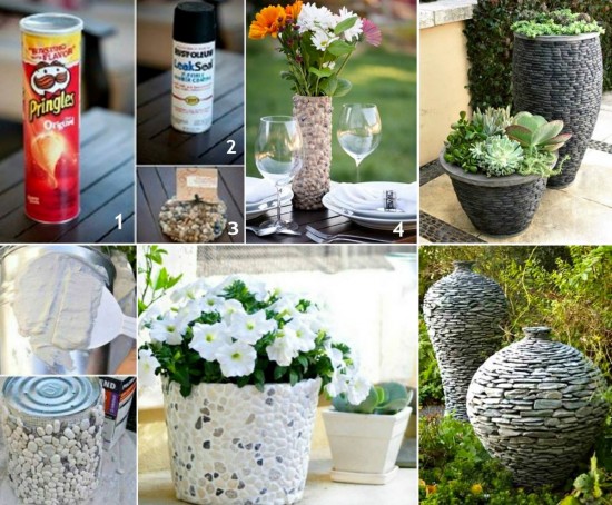 Безсумнівно можна зробити корисні вироби для дачі у вигляді кашпо. садових вазонів і просто декоративних скульптур. Робляться такі вироби дуже просто. Візьміть порожню банку з – під чіпсів і обклеюємо її камінчиками. Таким чином можна обклеювати будь-які ємності і форми, а потім розташовувати їх в саду і городі.