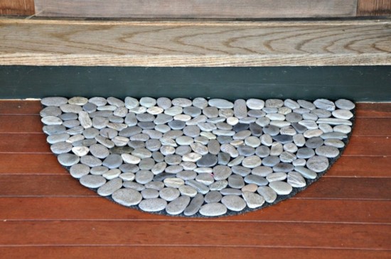 Форма килимка в передпокій може бути будь-який – круглої, прямокутної, полудугой. Розстелите гумову основу і приклеюйте камінчики або відповідно до задуманого візерунком, або хаотично. У будь-якому випадку це буде красиво! І більш того, килимки з камінням для ніг дуже корисний. Ви можете робити масаж для ніг.