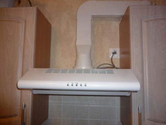 2.Встроеннимі. Основна частина девайса «ховається» в гарнітурі, а зовні видно лише панель. Для частини воздуховода, який виходить за межі укриття, передбачений короб. Він може бути виконаний в багатьох варіантах, відповідно вся система примусової вентиляції підлаштовується практично під будь-який стиль.