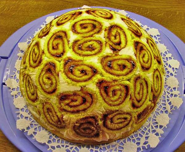 - Остиглий бісквіт розгорнути, змастити начинкою і знову закрутити. Рулет-основа для королівської шарлотки готовий. Начинка для рулетів може бути різноманітна: від ягідного пюре, до заварного крему.