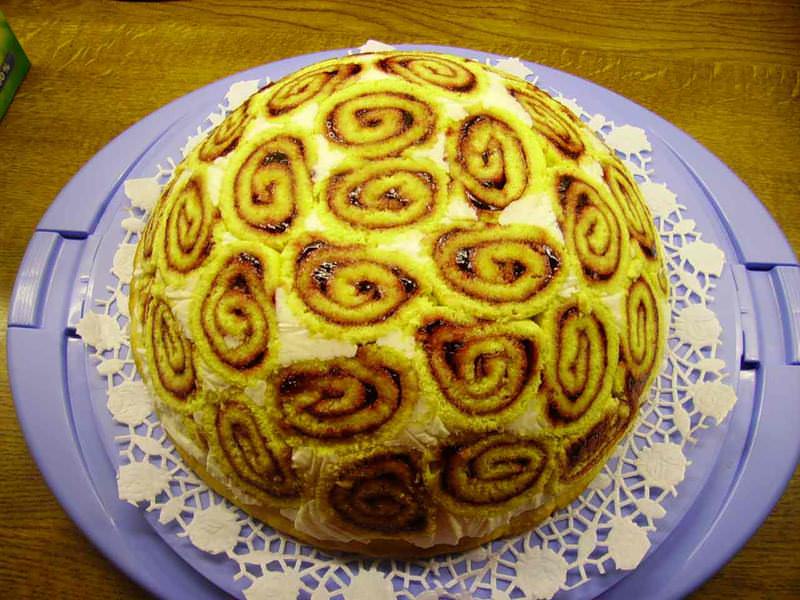 - Миску з круглим дном застелити плівкою і обкласти шматочками рулетів, чергуючи звичайний і шоколадний. Залити сумішшю желе з фруктами і дати повністю застигнути. Потім зробити шар зі шматочків рулету і на них вилити вершки з фруктами і желатином. Залишити в холодильнику на ніч.