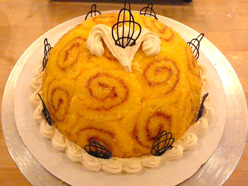 - Глибоку напівкруглу форму вистелити плівкою і викласти дно і боки порізаним на скибочки рулетом. Викласти половину сиру на рулети, поверх – яблучне суфле, потім залити другою частиною сирної маси. Закрити плівкою і залишити в холодильнику для застигання.