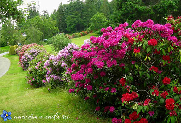 - рододендрони – чудово квітучі красиві чагарники, які до того ж вважають за краще бути вкритими від полуденного сонця. Традиційно представників роду підрозділяють на рододендрони та азалії. Рододендрони, що ростуть в тіні в середньому досягають у висоту 1,5 метра, цвітуть у травні, однак є рослини як 30 см, так і 6 м, квітучі як ранньою весною, так і восени, в серпні. Забарвлення квітів разноообразние, за винятком блакитний, листя овальні або довгасті, зимуючі. Для всіх рододендронів характерно неглибоке залягання коренів, тому грунт під рослинами мульчують, в суху погоду рясно поливають.