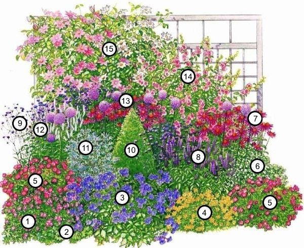 1. Герань Ендресс. 2. Манжетка м'яка. 3. Герань велична. 4. Кореопсис мутовчатий. 5. Перстач чагарникова. 6. Деревій птармика. 7. Декоративний цибулю. 8. Многоколоснік фенхелевий. 9. Вербена бонарская. 10. Самшит. 11. Декоративна полин. 12. Лофант. 13. Ехінацея пурпурна. 14. Хатьма. 15. Клематис