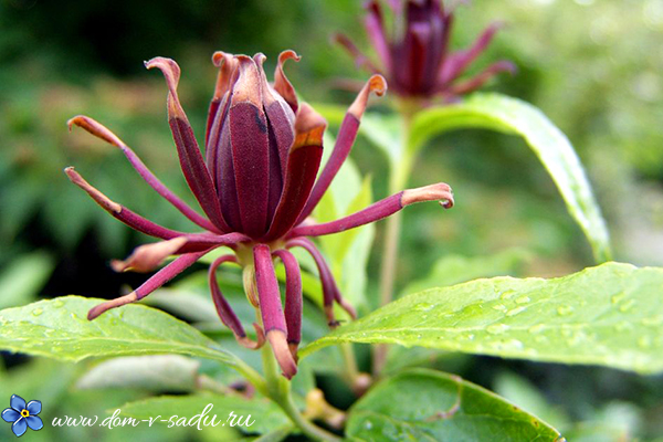 - калікант прикрасить сад оригінальними квітками-лататтям. Це гарний, витривалий, але рідкісний чагарник з Північної Америки. Квітки великі з численними пелюстками. Всі частини садового рослини ароматні. Цвіте в червні – липні. Потрібно обрізка навесні.