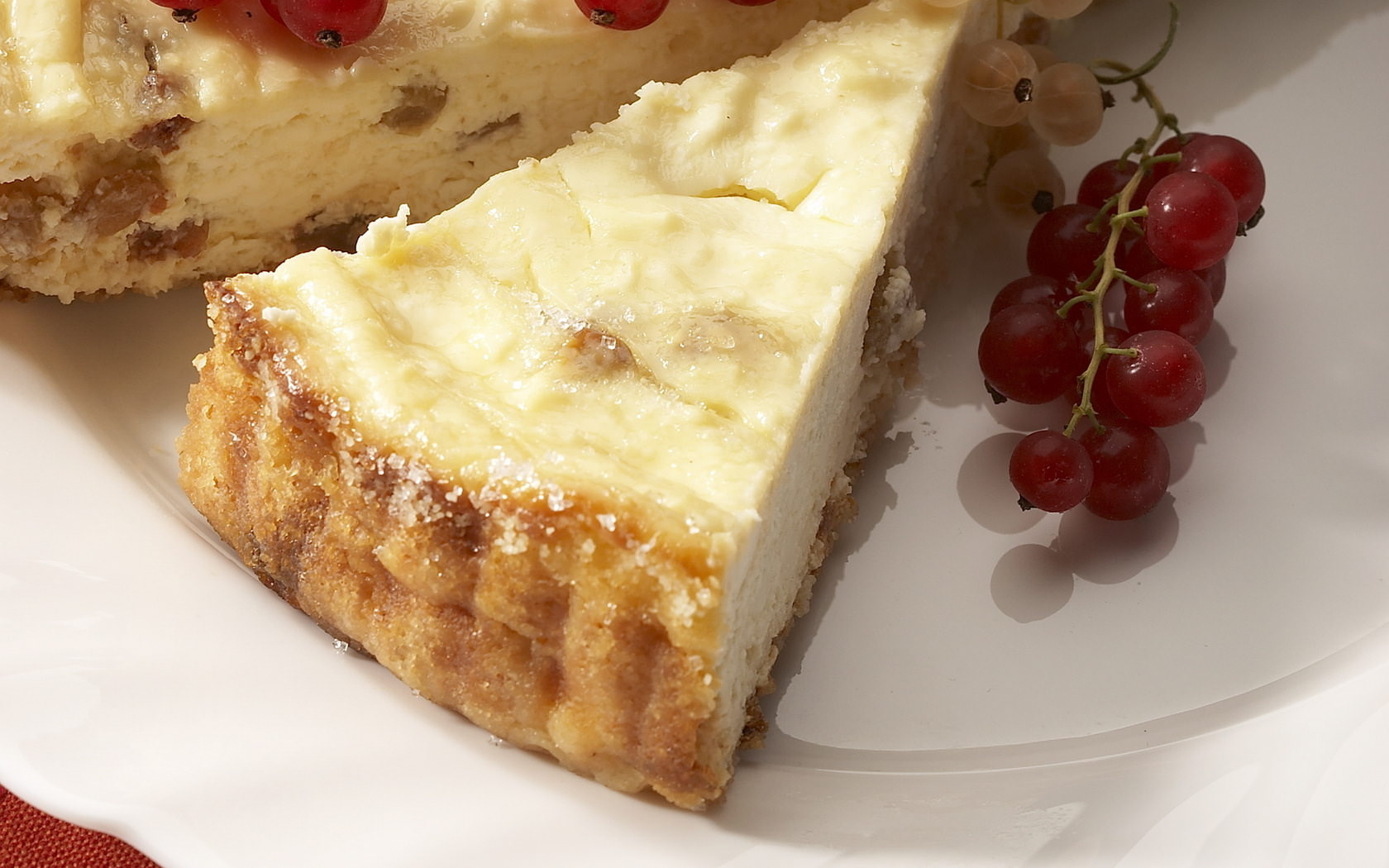 - Сирну масу викласти у великій деко, розгладити лопаткою. Красиво укрити всю поверхню часточками яблук, посипати родзинками.