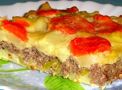 - Потім потрібно покласти фарш, поверх нього розкласти картоплю і цибулю. Завершальний шар – з картоплі.