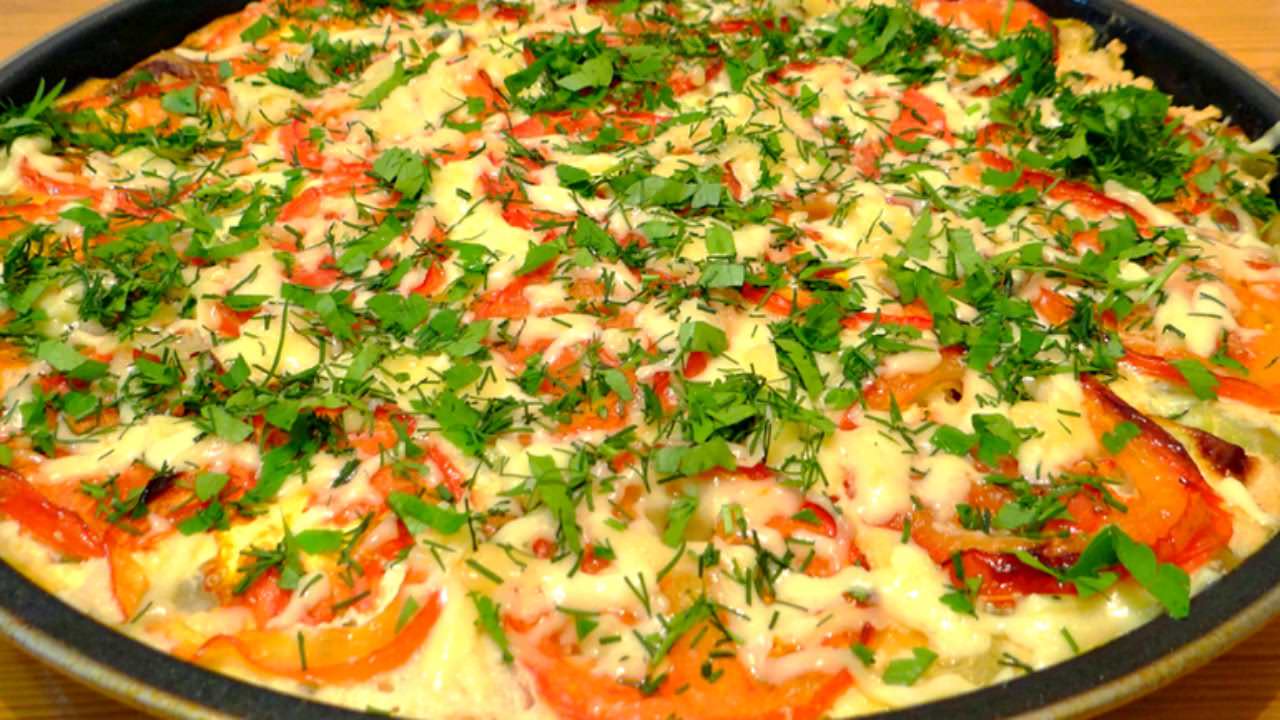 - Зверху посипати яйцями, полити заливкою зі сметани і кетчупу, посипати сиром.