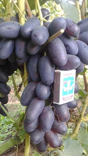 Ягода синьо-чорна (темно-синя), подовжено-овальна, розмірами 33 на 20 мм. Шкірочка середньої міцності, м'якоть хрустка. Смак гармонійний, десертного типу.