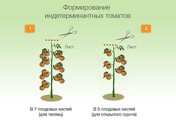 - Однак, різниться обмеження точки зростання і кількість плодових кистей. Так, при вирощуванні в теплиці у куща залишають 7 плодових кистей, у відкритому грунті – 5.