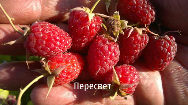 Високі, але компактні кущі Пересвіту утворюють середню кількість порослі. Дворічні пагони коричневі, однорічні – червонуваті, без воскового нальоту. Тверді, з пурпуровим підставою шипи розташовані по всій довжині стеблей.Для сорти Пересвет характерні темно-червоні ягоди середньою масою 2,5-3 г. Їх м'якоть щільна, солодко-кисла, без аромату. Дегустаційна оцінка – 4,7 бала. Один гектар малини Пересвет в середньому приносить 44,2 центнера плодів.