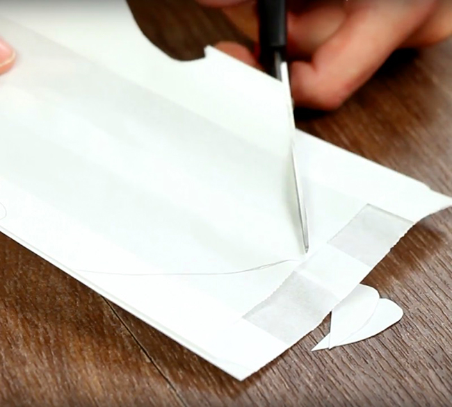 Далі на одну частину паперового пакета наклейте двосторонній скотч по вертикалі і горизонталі. Зверху прикладіть другу частину пакету і притисніть деталі разом дуже міцно. Так потрібно зробити з усіма заготовками з пакета.