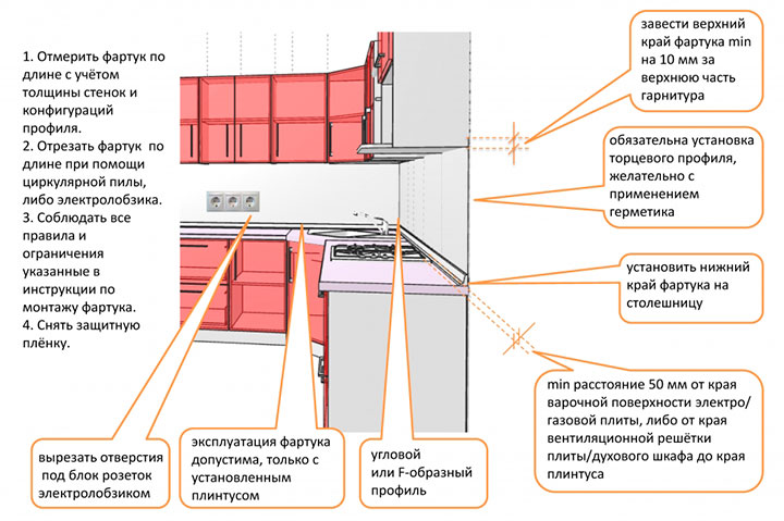 Монтаж фартуха не представляє особливих складнощів. Під час установки не потрібна наявність будь-яких спеціалізованих інструментів. При покупці панелей в комплект входить все необхідне. З супутньої фурнітури знадобиться сполучна планка. Підбирають її виходячи з особливостей кухонного гарнітура.