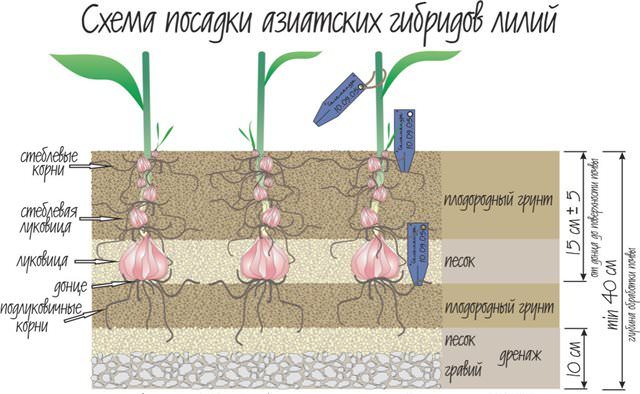 Важливо пам'ятати, що азіатські лілії зовсім не переносять наявності вапна в грунті, тому при предпосадочной підготовці ґрунту на ділянці необхідно внесення торфу. Як мульчирующего шару рекомендується використовувати хвою, яка не тільки дозволяє зберегти рихлість грунту, але і допомагає підтримувати необхідну для росту і розвитку декоративної культури слабокислу реакцію грунту.