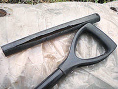 Для важеля знадобиться півметровий відрізок пластмасової труби. Купуємо в магазині і пластикову ручку-насадку для держака, яку використовують для вил або лопат. Трубку розрізаємо уздовж, одягаємо на рукоятку і закріплюємо ізолентою так, щоб вона не ковзала. Тепер вийшов важіль виступає приблизно на 25 см від держака з обох сторін.