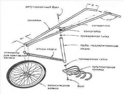 Від велосипеда знадобиться рама і одне колесо. До рами прикріплюється культиваторна головка.У цій же якості може використовуватися ріже частина дворучний пилки, невеликий плуг або сталеві гострі прути, виготовлені самостійно. Рукоятки для управління механізмом виготовляється з алюмінієвих або сталевих труб. Обрізок труби приблизно в 2,5 см діаметром стане в нагоді як поперечної перемички.