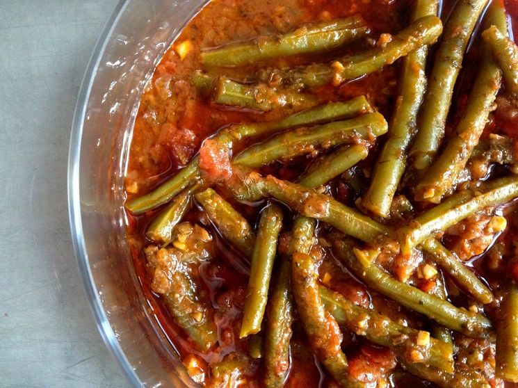Стручки квасолі промити, дати стекти воді і обрізати обидва кінчика, знімаючи і поздовжнє волокнисту нитку, якщо така є. Підготовлену квасолю порізати на 3-4-сантімеровие брусочки і, опустивши в ту ж воду, де ошпарюють томати, проварити її протягом п'яти хвилин. По закінченні цього часу воду злити.