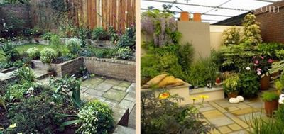 Посадки найкраще робити за каскадним принципом, коли маленькі рослини в квіткових горщиках виставляються на передній план. Розмір рослин збільшується поступово. Високі квіти, кущі та малорослі дерева можна поміщати в вазони або навіть бочки. За допомогою каскадного дизайну легко створити ефект, коли погляд спостерігача ковзає вгору по діагоналі. Подібний же результат можна досягти, якщо використовувати вертикальні сади.