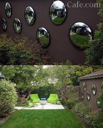 Навіть присутність сусідського гаража, стіна якого частково замінює паркан, що не виявиться зайвим, якщо прийняти її в якості повноцінного учасника в свою гру з оптичними ефектами. Прикріплені до цієї стіни опуклі дзеркала спотворюють відображення садка. Новоутворена в них перспектива глибше, ніж це є насправді. Такі «бабки очі», розміщені на стіні кольору шоколаду, перетворюють невеликий газон в досить простору галявину.