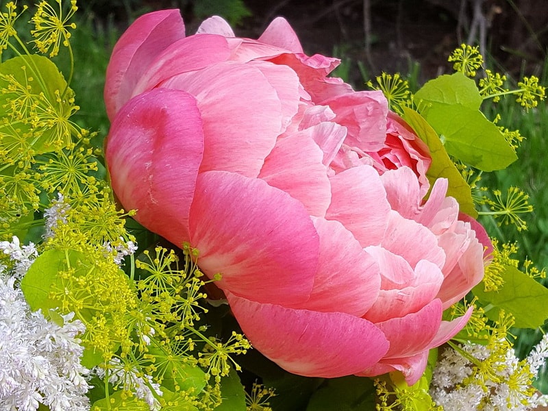 Добре впишуться в ансамбль волошки і незабудки, нігтики і айстри, гвоздики і півонії.