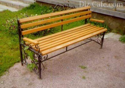А ось садова лава з кованими елементами виглядає добре, але з працею виготовляється своїми руками. Ковані елементи краще замовити в спеціалізованій майстерні