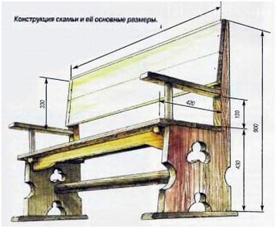 Схематичне зображення лави, на якому вказуються приблизні розміри основних деталей. Дана лавочка виготовляється з використанням електроінструменту, що дозволяє прискорити хід оздоблювальних і складальних робіт