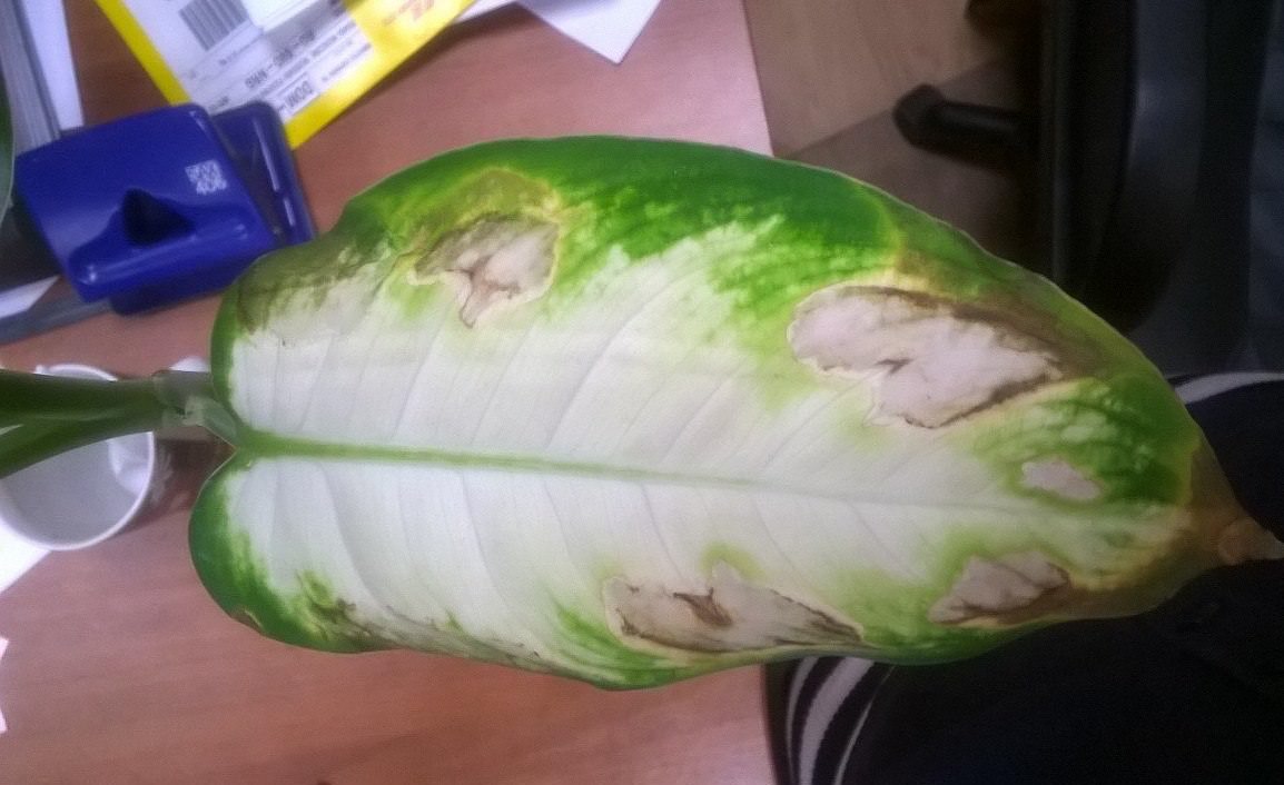 До порушення правил по догляду за рослиною можуть привести кілька факторів. На першому місці стоїть неправильний полив – він може бути або надмірно рясним, або недостатнім. Повітря в приміщенні, де знаходиться диффенбахія, може бути дуже сухим. Також це стосується і офісних приміщень, де освітлення в більшості випадків штучне, а сам вазон стоїть на підвіконні, куди практично не проникає сонячне світло. Як би це дивно не звучало, але до порушення по догляду за рослиною, можуть бути причетні і домашні тварини. Вони можуть гризти або дряпати листя квітки, але пошкодження можуть бути непомітні на перший погляд. Таким чином може заноситися інфекція, яка заважає нормальному розвитку рослини.