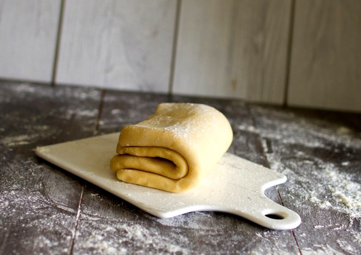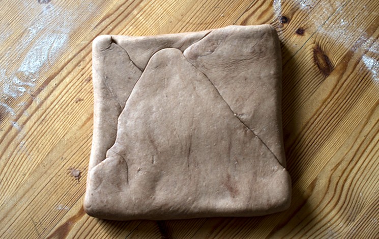 Відлежатися в холодильнику тісто дістати і розкачати в прямокутний пласт розміром приблизно 52х18 сантиметрів. Короткими сторонами всередину скласти пласт внахлест так, щоб вийшло три шари, а сам вийшов пласт прийме форму приблизного тришарового квадрата. В черговий раз звернути тісто в плівку і відправити в холодильник на 2 години отстойкі.