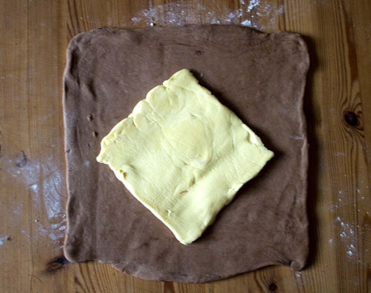 - Тісто розкачати на присипаної борошном обробній дошці в прямокутний пласт. На середині його поверхні рівномірно розкласти третю частину нарізаного пластинками масла, попередньо обваляти кожну з них в борошні. Пласт з маслом посередині загорнути конвертом, міцно защіпнув по краях з'єднань.
