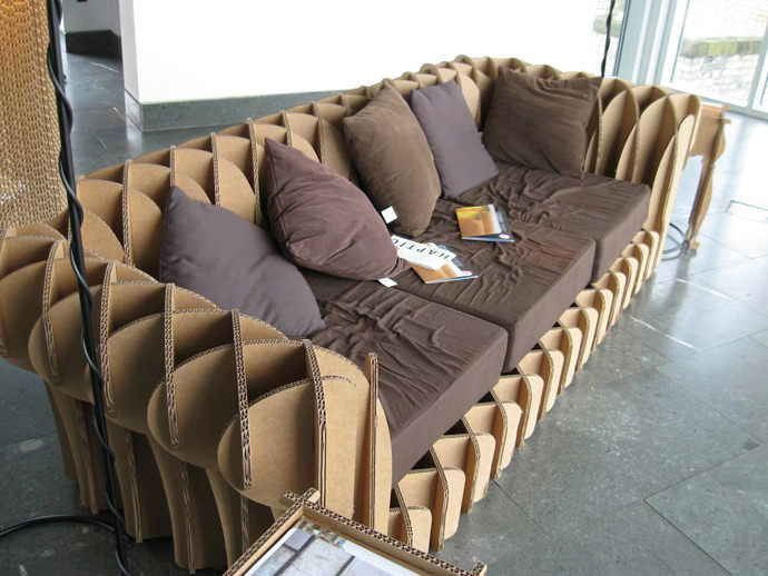 Так як картон легко піддається деформації і дуже гнучкий, з нього можна виконати абсолютно будь-які конструкції. При цьому завдяки жорсткості меблі з картону прекрасно витримує вагу навіть дорослої людини.