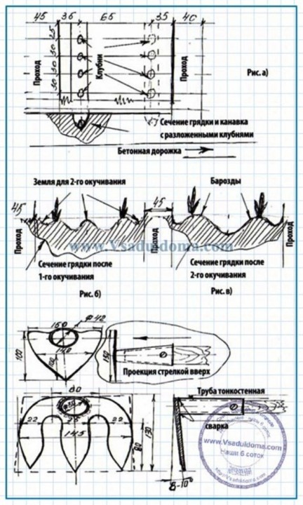 Саджу зазвичай 8-17 травня (коли на березі лист приблизно з десятикопеечную монету). Перше підгортання проводжу, коли висота паростків 12-15 см. Між паростками для підгодівлі злегка розкидаю мінеральне добриво для картоплі. Злегка підсапую відразу два рядки так, щоб частина землі з міжрядь залишалася для другого підгортання (рис. Б).
