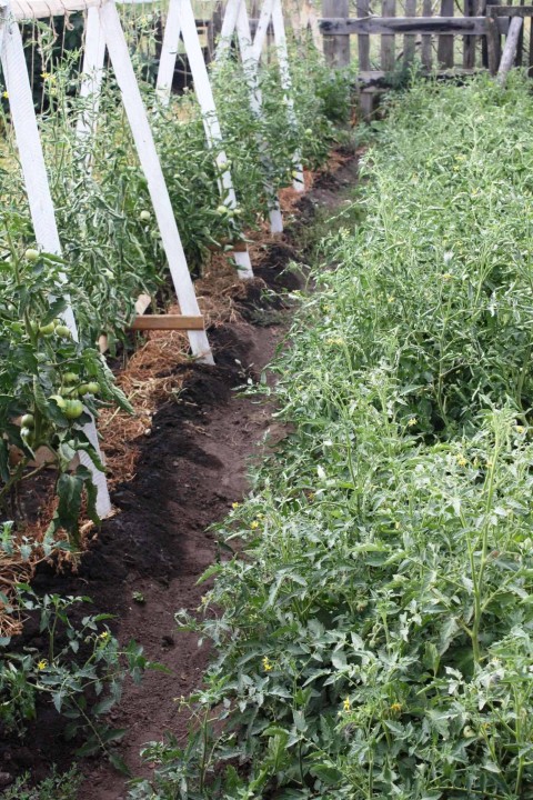 Однак вважаю цей спосіб менш трудомістким, більш продуктивним. При цьому борозни добре освітлюються і провітрюються, кущі хворіють менше. Переміщаючись по проходах, їх легше оглянути, полити, підгодувати, обірвати квітки і т.д. Міжряддя НЕ затоптуються.