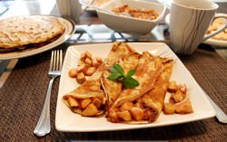 Ніжні, тонкі млинці з пшеничного борошна, мають аристократичної блідістю, добре піддаються згортання через їх еластичності.