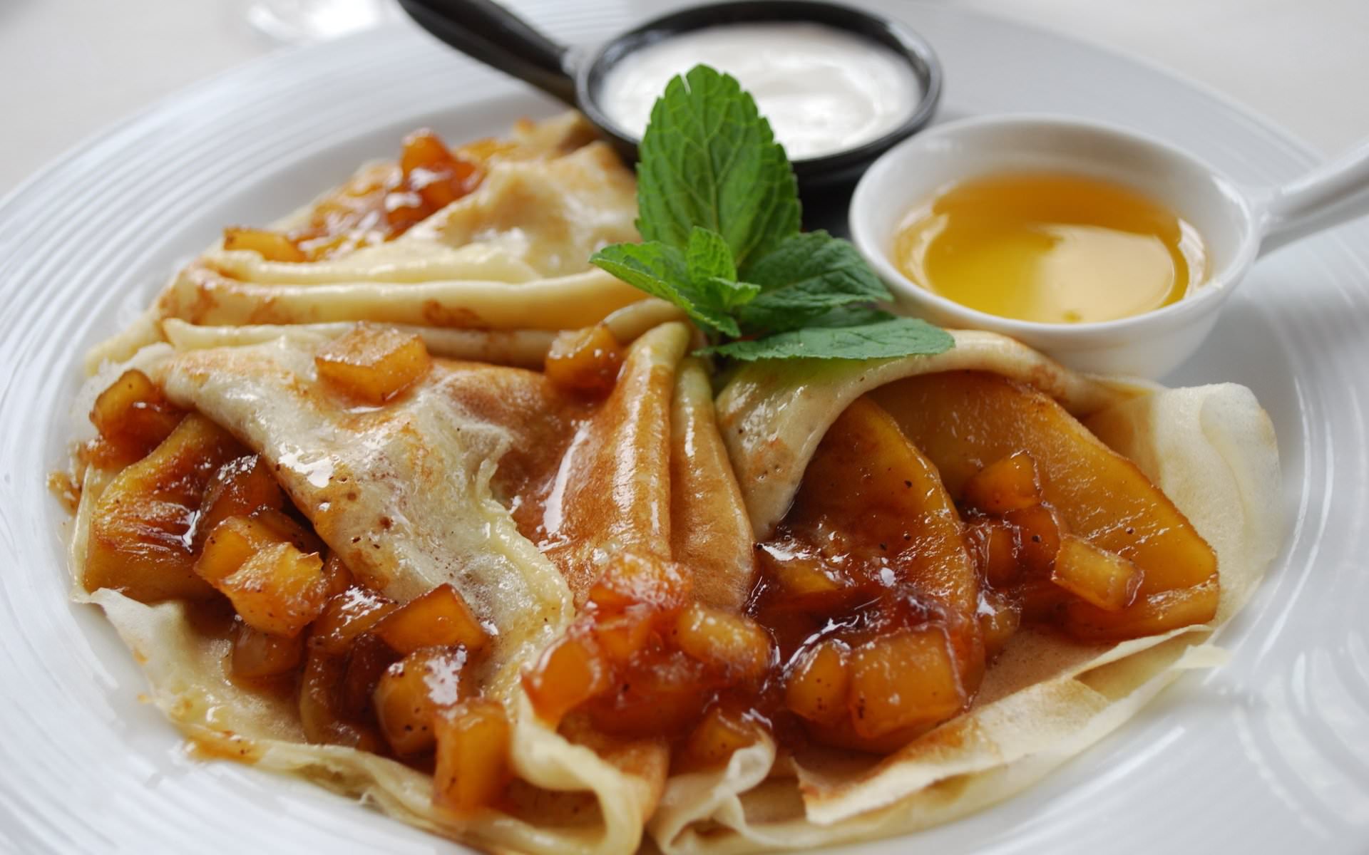 Виходять дуже смачні млинці, які перед подачею варто прикрасити листками м'яти і пудрою. Подавати їх можна з морозивом, наприклад, ванільним.