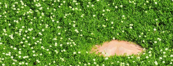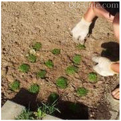 Створити такий газон, витративши для цього мінімум часу, можна за допомогою невеликих дернин, вирізаних ножем з уже розрісся трав'яного килима. Для цього на підготовлений грунт (розпушений, звільнену від бур'янів, гарненько пролиту водою) укладають вирізані дернини, притоптуючи їх ногами.