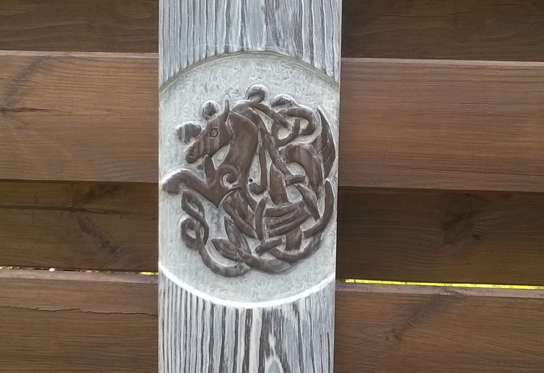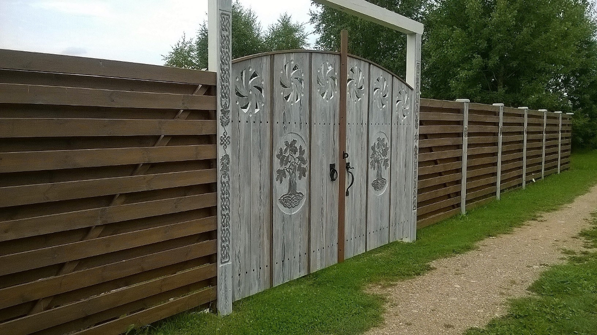Почали освоювати ділянку з паркану. Його, різьблені ворота з кельтськими орнаментами (різьблення і багатошарове фарбування), саму ідею – це все втілив чоловік. Кельтські орнаменти тому, що навколо росте багато вікових дубів. Древо життя на воротах – в міфології символ мудрості, моральної і фізичної сили і краси. Коріння і гілки – це ідеї, залишені нам минулими поколіннями і пов'язані воєдино стволом древа життя. Орнаменти на стовпчиках – зображення різних тварин.