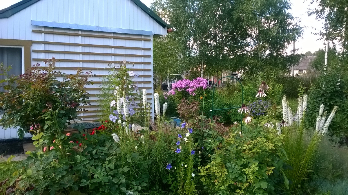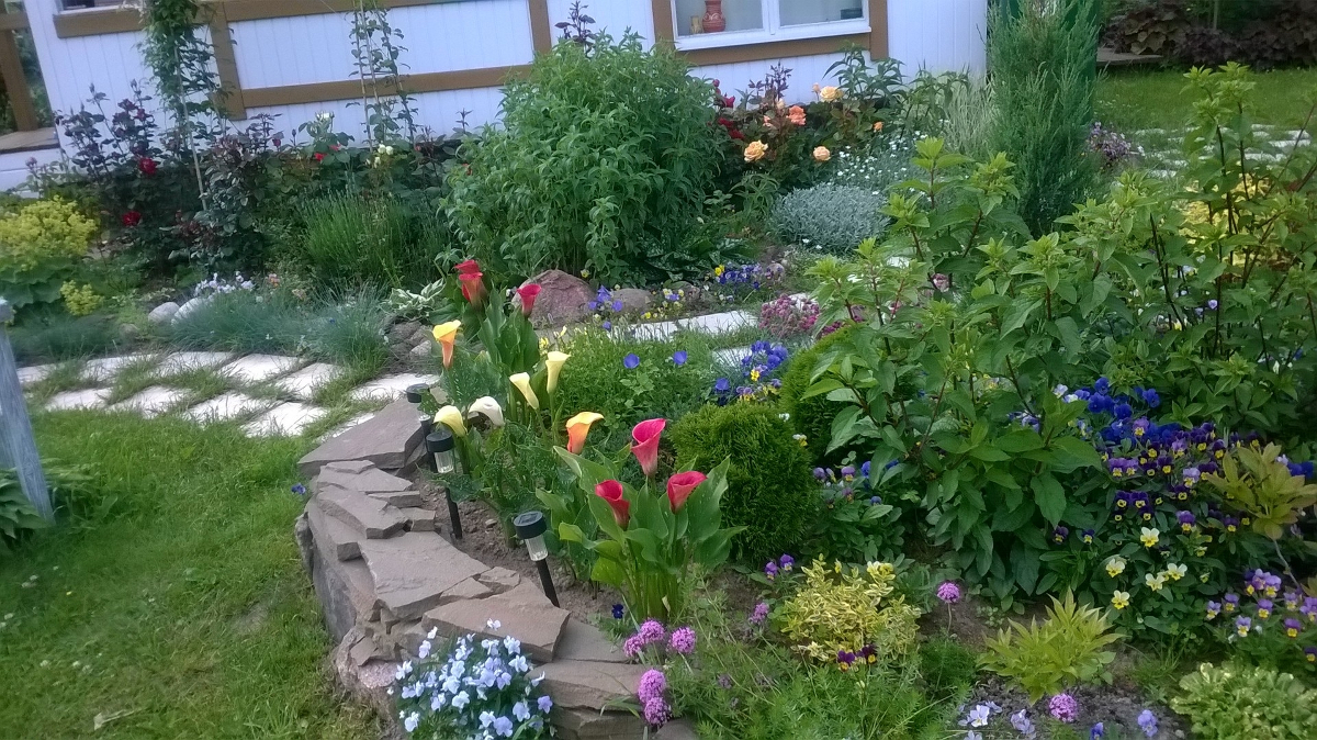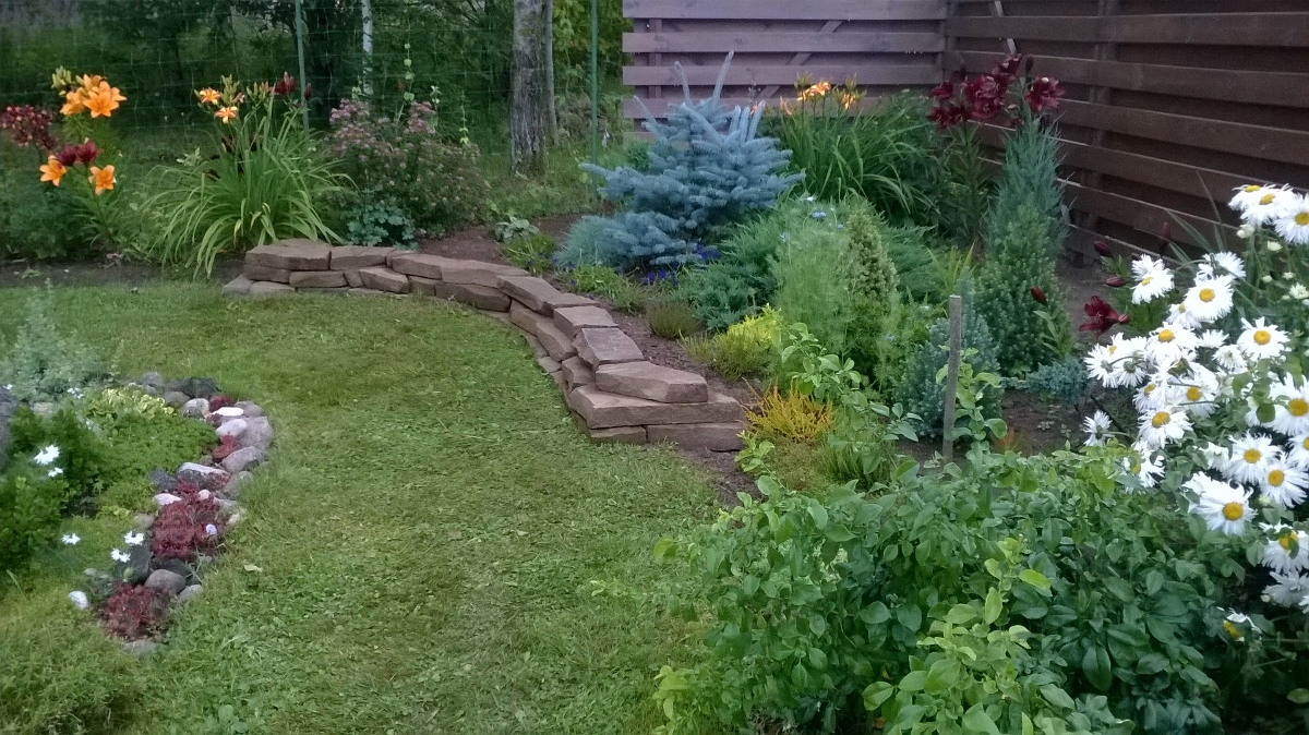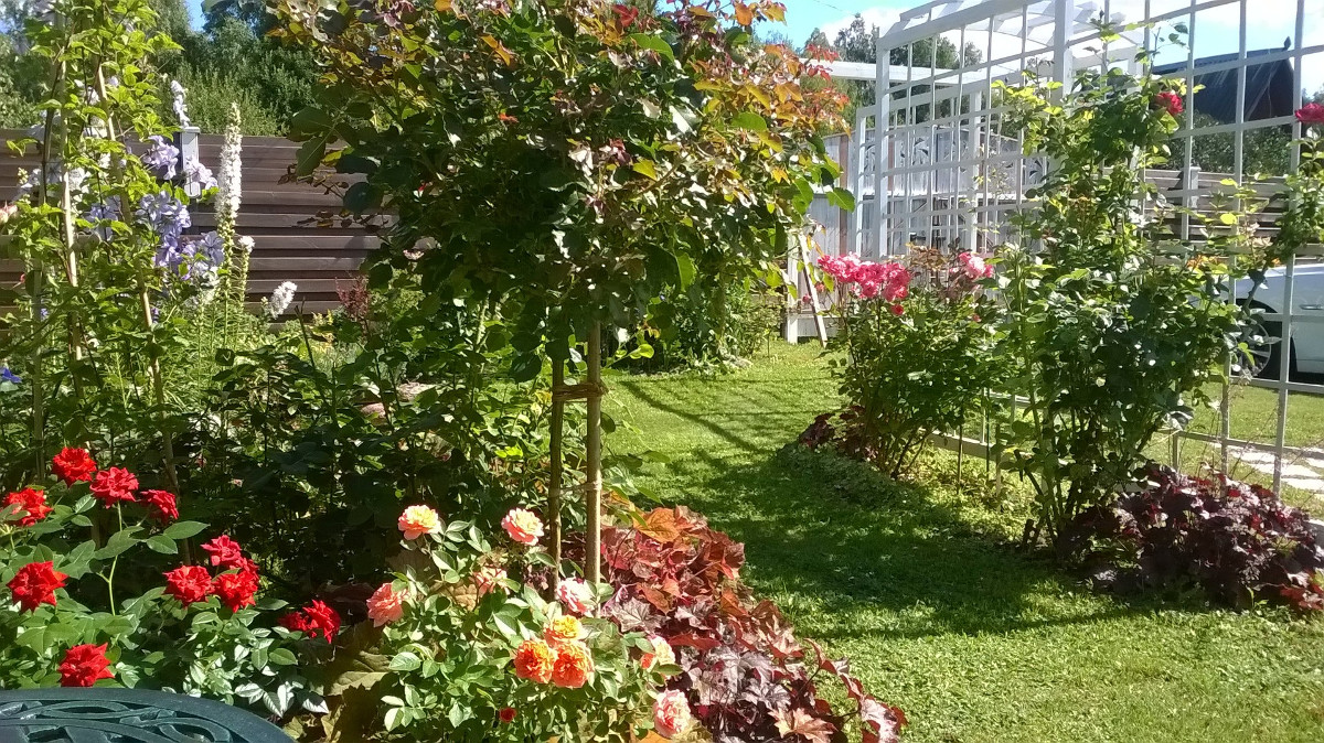 Ділянка плоский, вертикалей поки не вистачає. Їх замінюють шпалери з арками і без, побудовані для високих троянд – клаймбер, які ще не досягли потрібної висоти. У перспективі вертикалі будуть створені хвойними рослинами (альпійськими соснами, ялицею, кедрової сосною, кипарисовик, які вирощую як бонсай, Колоновидні ялівцю, канадськими та блакитними ялинами). Невисокі, які ошукують очей підпірні стінки теж надають плоскому ландшафту деяку різноманітність.
