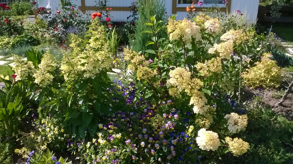 Часто сад сам підказує тобі рішення, як зробити краще, зручніше, красивіше. Виросли самосівом віоли між гортензіями – це просто чудо. Я їх залишила, хоча вони заховали мої молоді ялівці. Нічого, навесні і восени пофарбувати.
