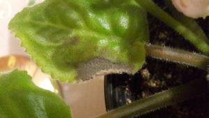 Така хвороба фіалок, як сіра гниль, проявляється появою коричневого гармата, що охоплює всю наземну частину квітки. Якщо вчасно не почати боротьбу, квітка помре за дуже швидкий термін.