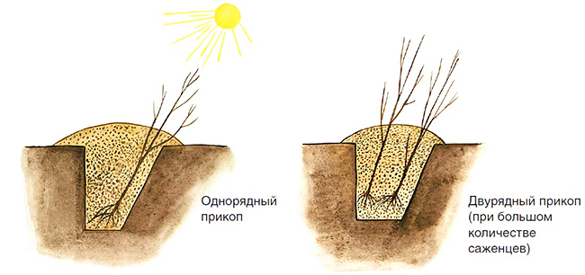 Придбані восени саджанці, взимку зберігають у прикопа, укладаючи їх під нахилом, крони саджанців орієнтують на південь. Найкраще їх розмістити в захищеному від вітру і полуденного сонця місці. Для захисту від мишей стовбури обмотують агроспаном або іншими негниючими матеріалами, розкладають отруєні приманки. Щоб земля добре осіла, ями для весняної посадки саджанців, готують восени.