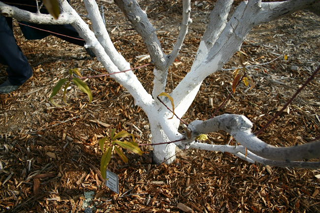 Побілити, а точніше, пофарбувати дерева потрібно восени або на початку зими. Для цього вибирають садову фарбу з додаванням фунгіцидів і хорошою клейовий основою. Вона допоможе позбутися від шкідників і збудників захворювань, що зимують в тріщинах кори. А в кінці зими – захистить дерева від сонячних опіків.
