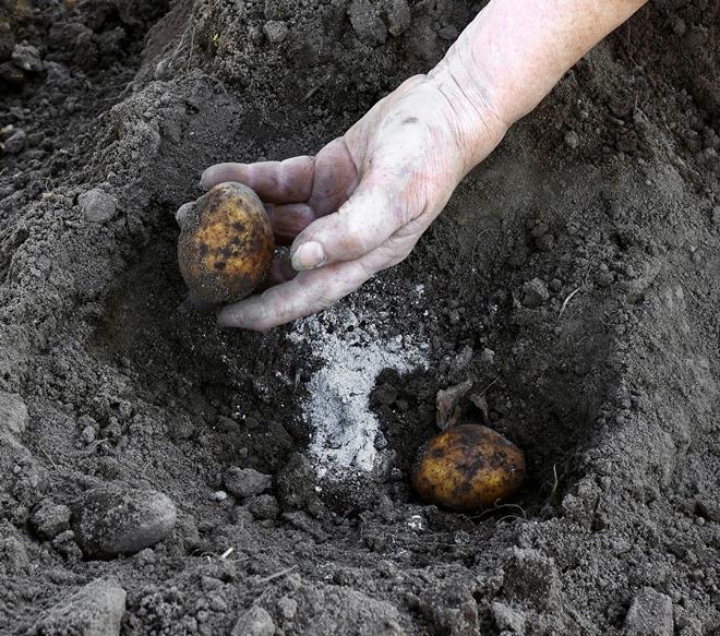 При посадці бульб картоплі рекомендується насипати жменю золи в кожну лунку