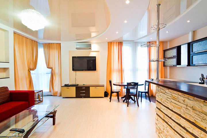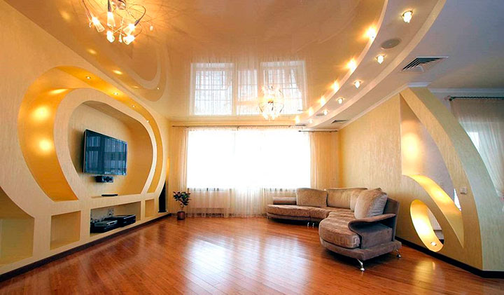 Вибираємо натяжні стелі дворівневі для залу: знайомимося з видовими особливостями обробки